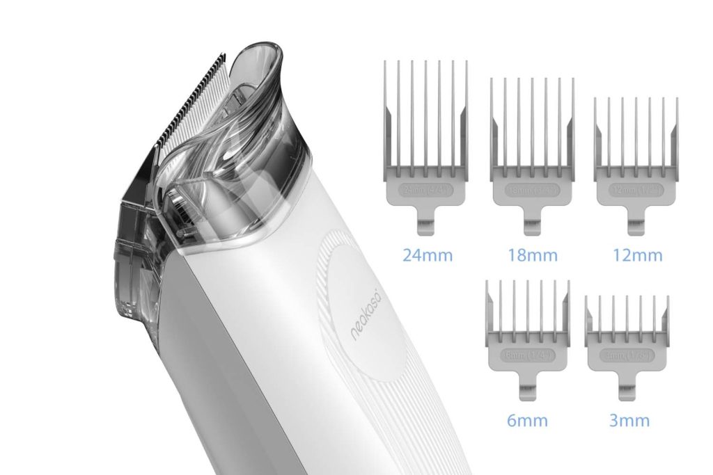 Zastřihovač elektrického střihacího strojku má integrované nastavení délky střihu 1.2 – 1.6 mm a dodává se s pěti nástavci, pro snadné nastavení délky stříhané srsti 3 mm, 6 mm, 12 mm, 18 mm a 24 mm.